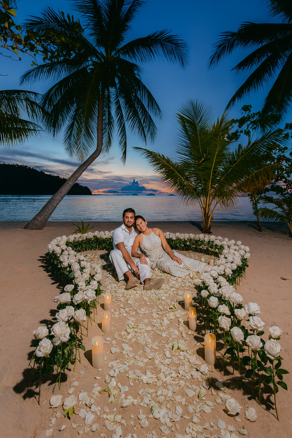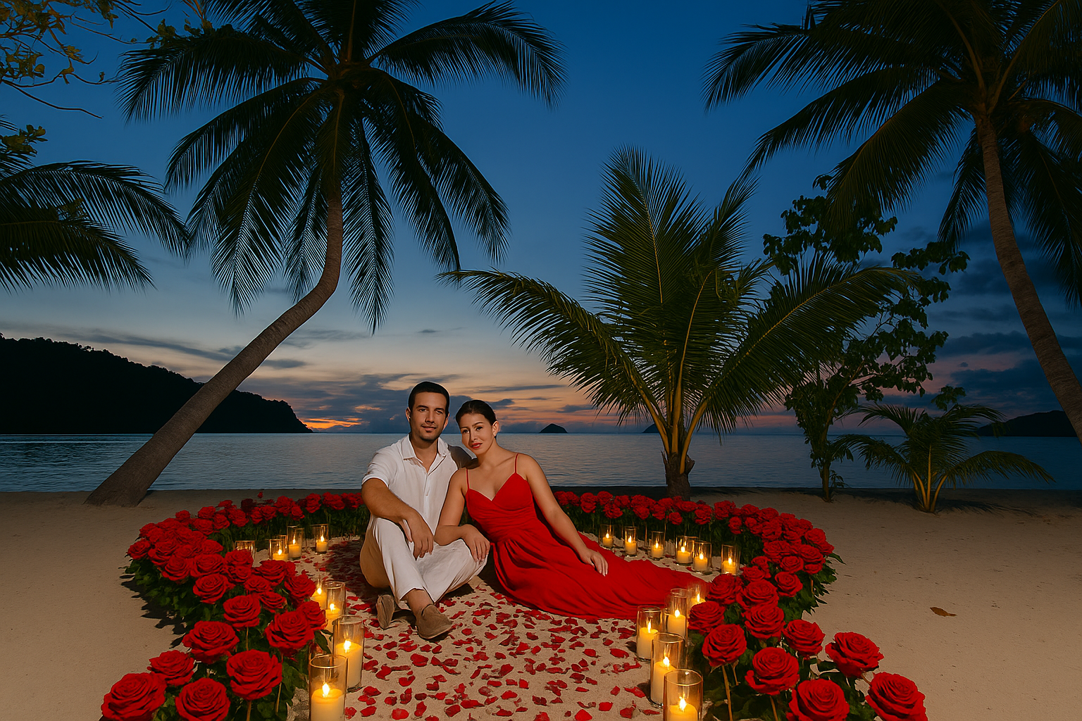 - 200 red, pink or white fresh or decorative (textile) roses on the sand